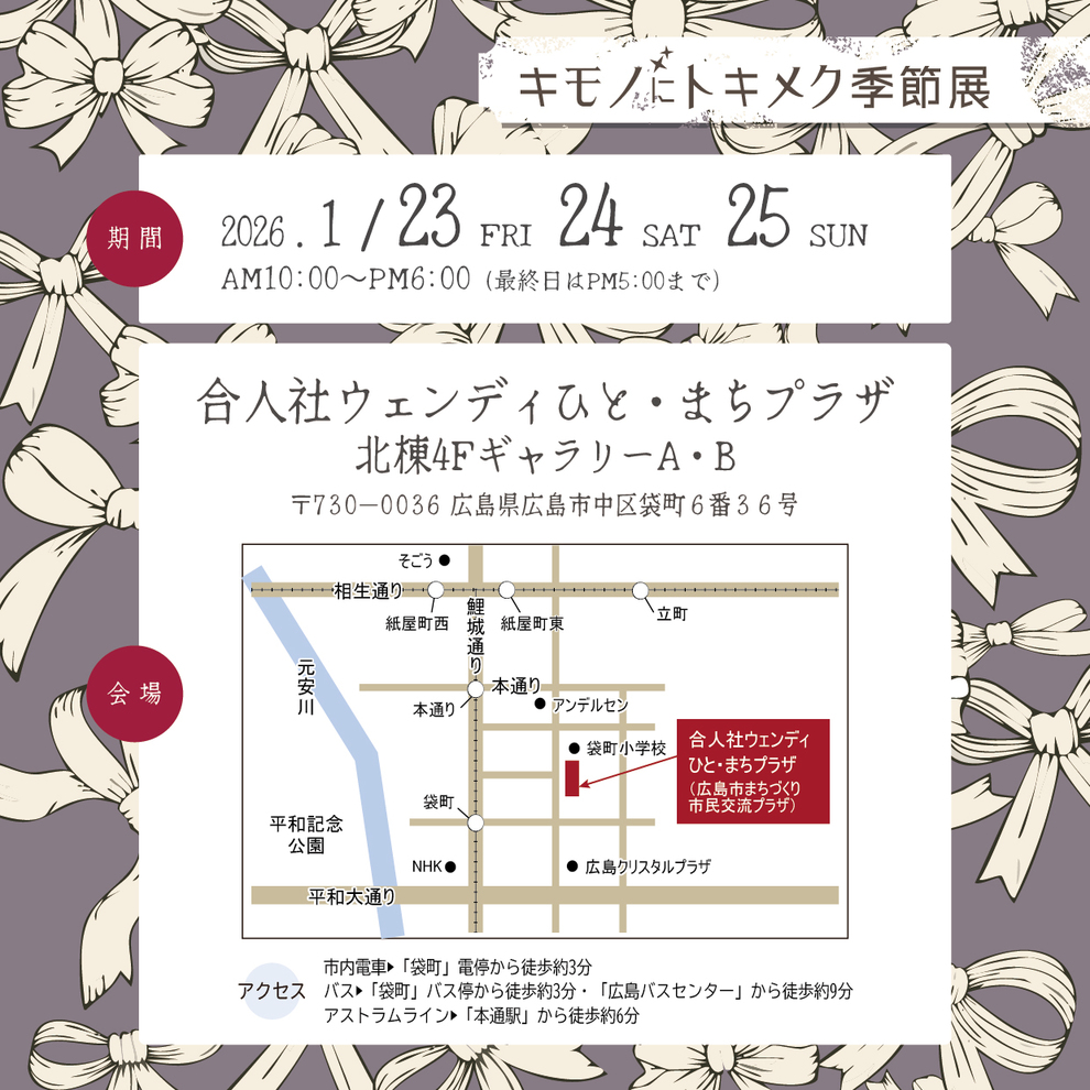 2025/11/10 イベント 2026/1/23~1/25「キモノにトキメク季節展」に出展いたします。 開催期間 2026年01月23日 ~ 2026年01月25日 時間 10:00~18:00(最終日は17:00まで) 会場 合人社ウェンディひと・まちプラザ 北棟4FギャラリーA・B EVENT一覧